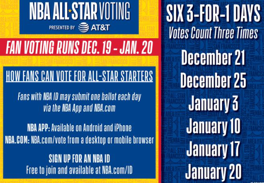 据悉,全明星投票规则依然和过去基本一致,10名首发球员将由50%的球迷投票、25%的媒体投票以及25%的现役球员投票共同决定,NBA主教练挑选14名被指定为“全明星替补”的球员。北京时间12月22日、12月26日、1月4日、1月11日、1月18日和1月21日将是三倍得票日,这一天的球迷投票,一票计为三票。